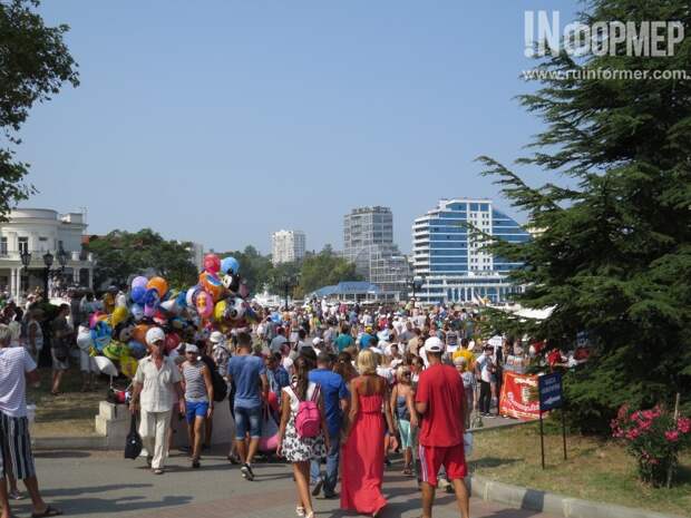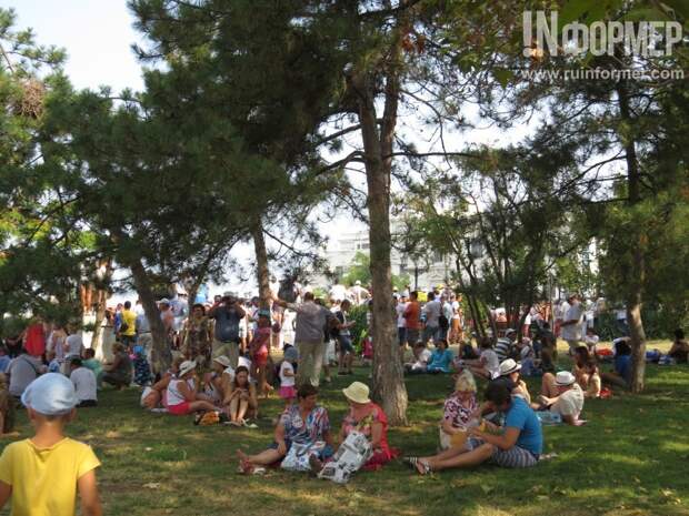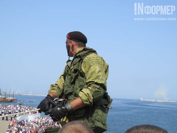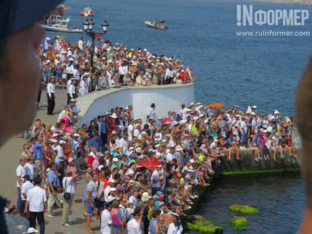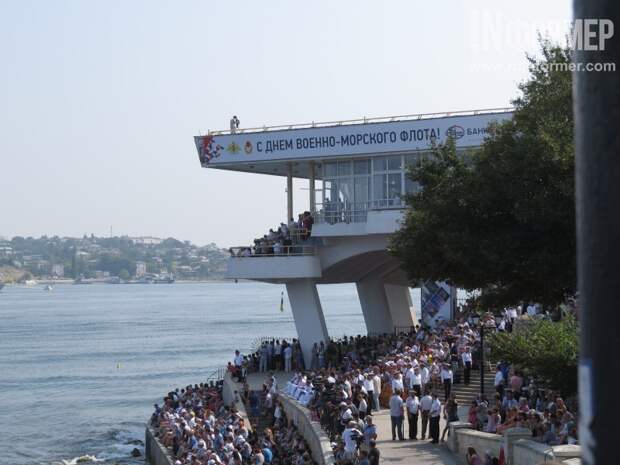 На Приморском бульваре Севастополя сегодня многолюдно, тысячи севастопольцев прибыли сюда, чтобы увидеть парад Военно-морских сил России. В ожидании действа люди занимали места на скамьях, парапетах, наиболее удачливые — рассредотачивались на трибунах.